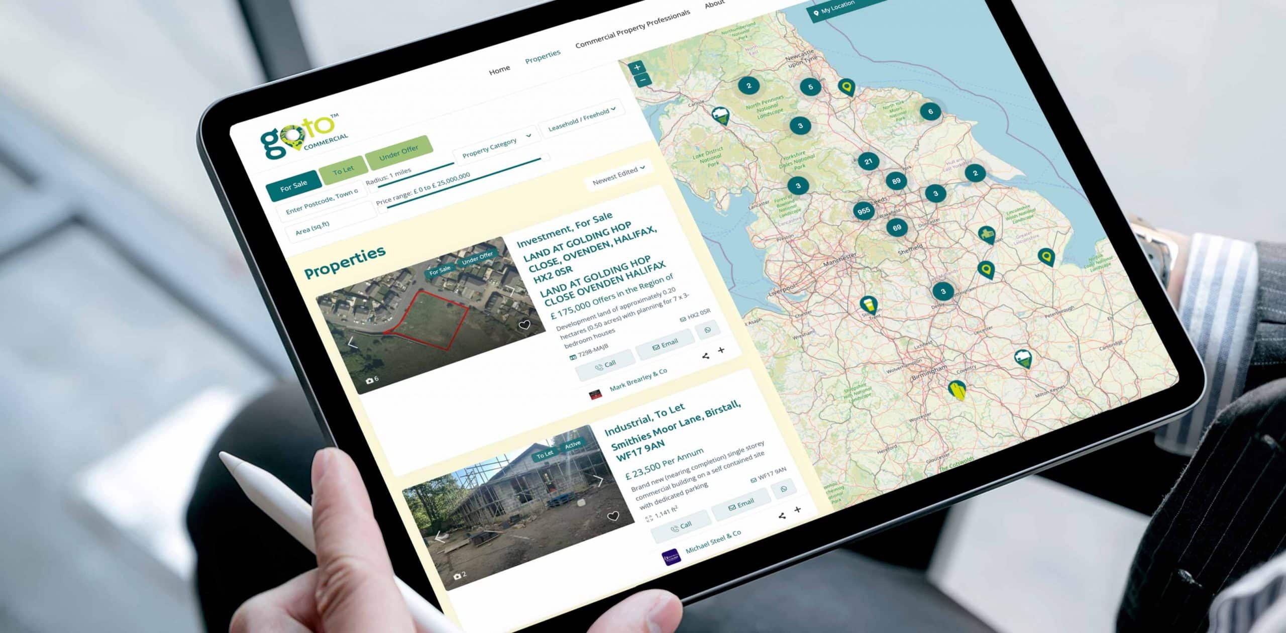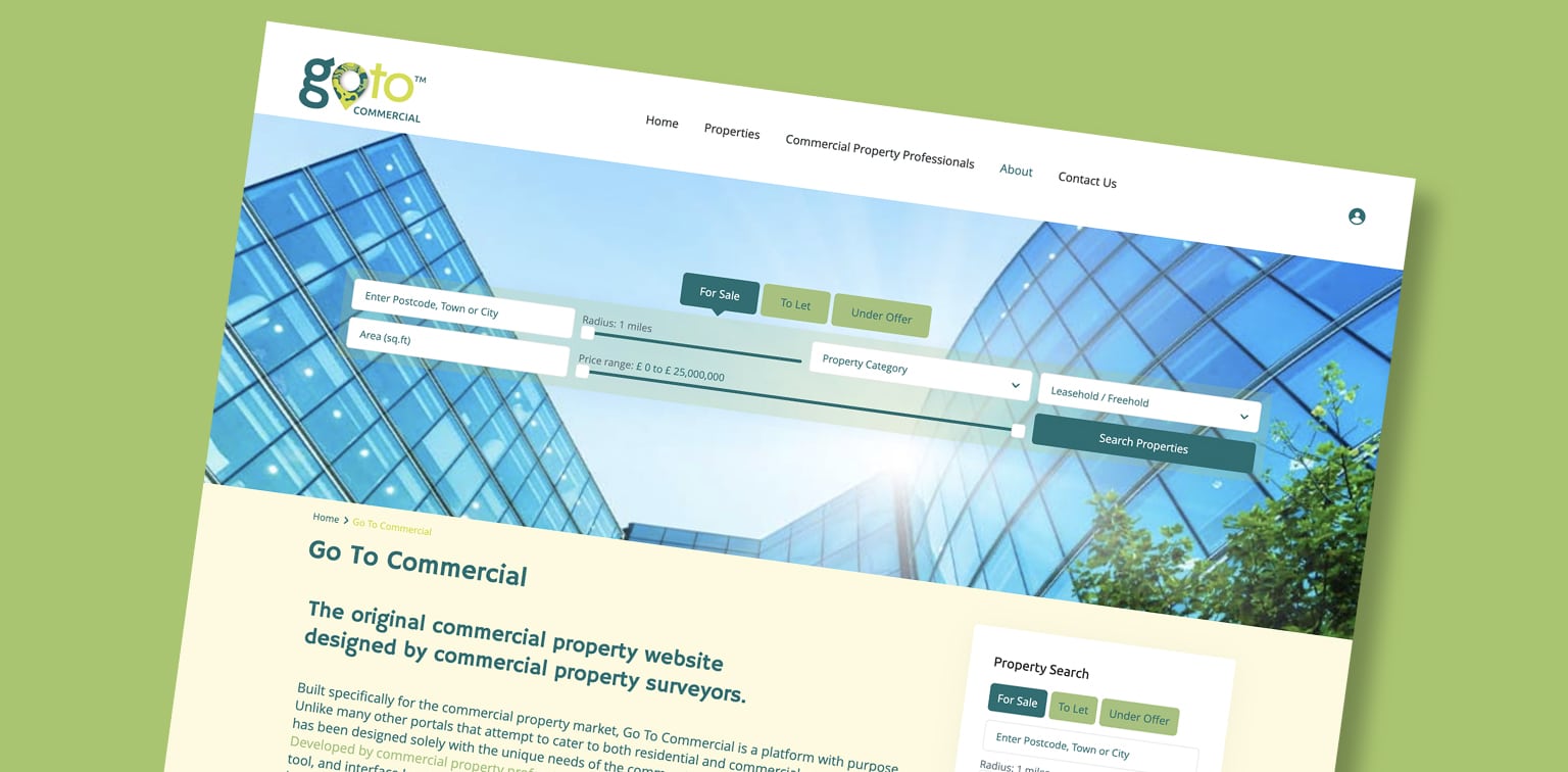 Maclaren Jones partnered with the founders of Go To Commercial to create a dedicated brand identity and digital platform built exclusively for the commercial property sector. The brief was to deliver a professional, sector-led alternative to re-purposed residential portals — one that genuinely reflects how commercial agents, surveyors and land professionals work.